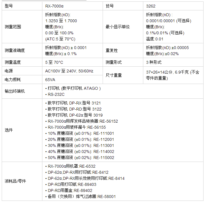 RX-7000α是依RX-5000α折射指數(shù)的測量范圍與測量溫度再加以改善的升級(jí)版本,并具有電熱模塊以維持恒溫。最適合用來衡量油品與脂肪的高融點(diǎn)、較高折射指數(shù)的香水、有機(jī)溶劑等。本產(chǎn)品具有手動(dòng)刻度制訂功能,可以協(xié)調(diào)其它折射儀所測量的不同標(biāo)準(zhǔn)液體值與測量值。